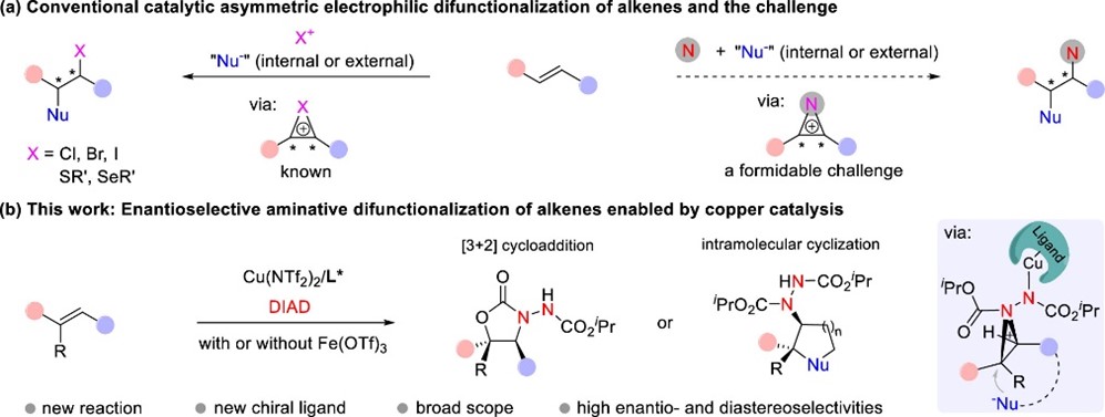 近期,该课题组取得了重要进展,发现通过二价铜盐作为Lewis酸对偶氮二甲酸酯试剂进行活化,使其形成高活性的亲电氮物种,在新发展的氰基噁唑啉手性配体的配合下,能够与烯烃的π键结合,高对映选择性地形成三元环氮鎓离子中间体,进而完成[3+2]和分子内环化反应。