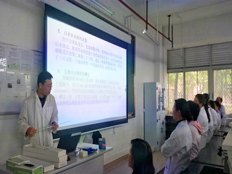 2019年1月15日,彭敏老师为大家介绍了基础化学实验室的情况,并主讲了“水硬度测定“实验。彭老师先是通过PPT方式将实验目的、实验原理、测试方法等进行深入浅出地讲解,随后协同参加交流的同事们分别进行了实验操作实践,大家重新回忆起以前当学生时做此实验的感受,同时也对分析化学实验教学有了进一步的体会和感悟,大家相互沟通交流,气氛轻松愉悦。