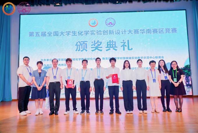 本届华南赛区竞赛于7月25-27日在广西师范大学举办,共有80所高校的186支队伍参赛,经专家函评,共78支队伍晋级现场答辩环节。我院分别选派队伍参加了科普、改进及新创三个赛道的角逐。其中:科普实验作品《分子盾牌:解锁防晒的化学密码》(指导教师:赖瑢、胡昌佳;队员:李思诺、蒋文、吴汭洋)和改进实验作品《老树发新芽——副产物分析驱动的Claisen-Schmidt反应制备二苄叉丙酮的改进与创新设计》(指导教师:李厚金,胡水;队员:李鹏阳、周文彬、王恩杰)荣获华南赛区一等奖,新创实验作品《光降解PET废塑料回收对苯二甲酸》(指导教师:胡鹏;队员:陈云涵、陈星宇、钟辰运)获评华南赛区三等奖。根据赛事章程遴选规则,由科普实验作品代表我校参加总决赛。在总决赛中,该作品在全国91项参赛作品中脱颖而出,荣获全国总决赛特等奖。