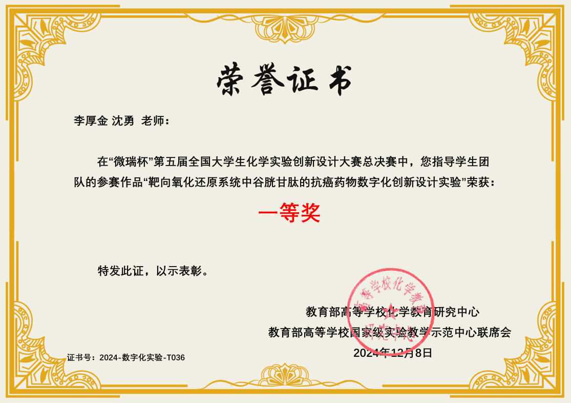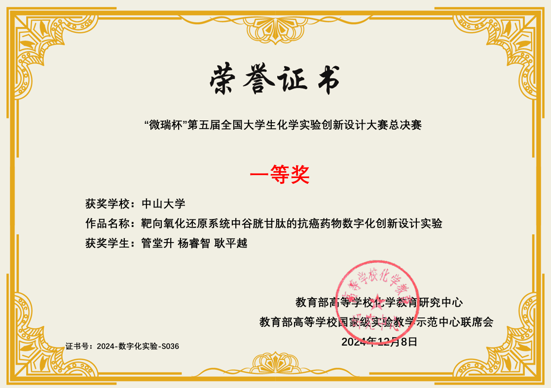 导航痕迹 中山大学 化学国家级实验教学示范中心 化学竞赛 第五届 (2024年和2025年) 全国大学生创新实验设计竞赛 中山大学-数字化实验-总决赛一等奖 扫描此二维码分享 中山大学-数字化实验-总决赛一等奖 发布人:网站管理员 发布日期:2025-10-09 靶向氧化还原系统中谷胱甘肽的抗癌药物的数字化创新设计实验
