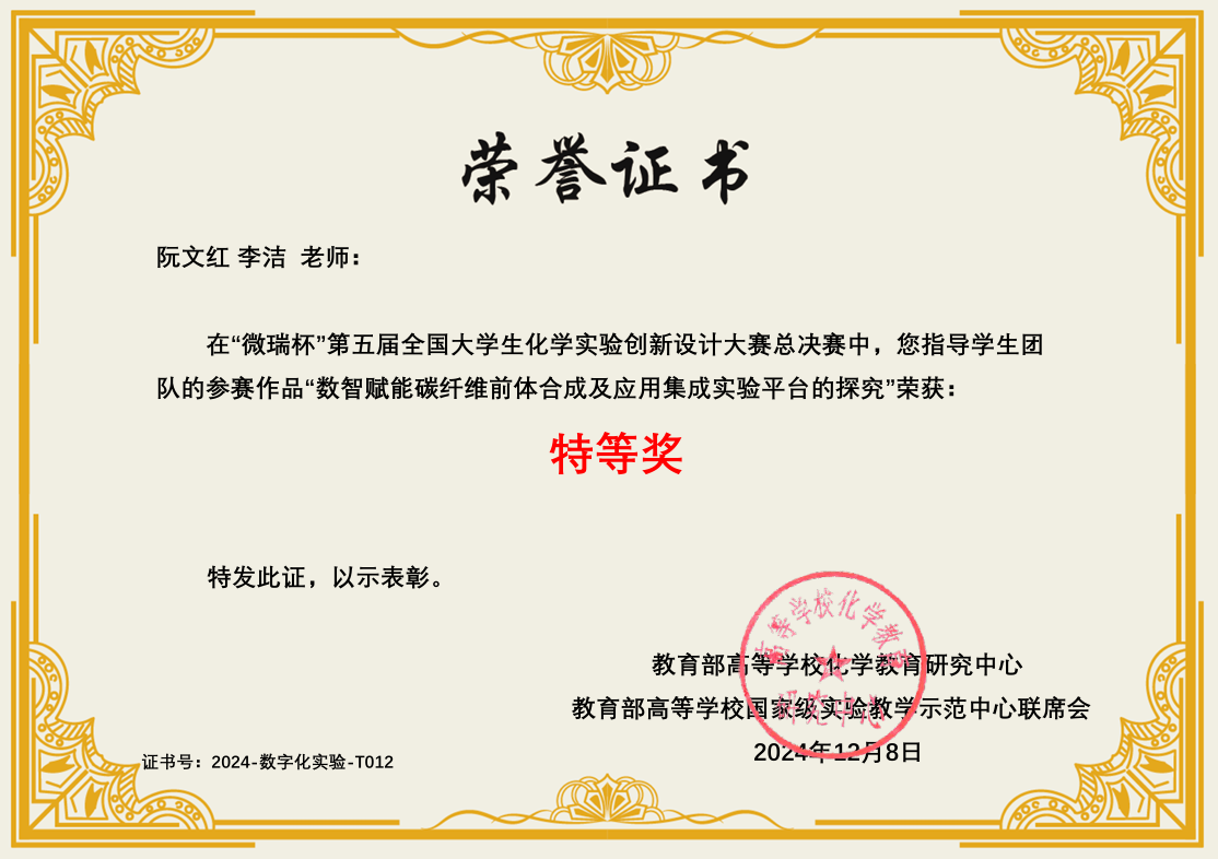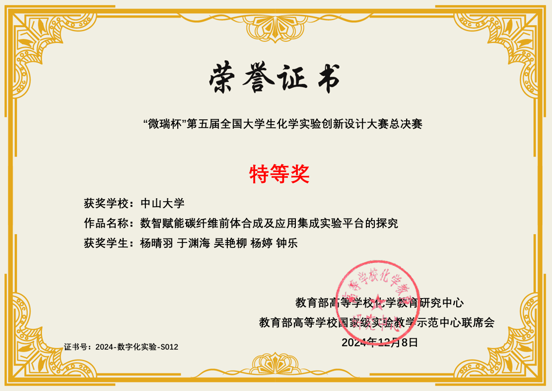 导航痕迹 中山大学 化学国家级实验教学示范中心 化学竞赛 第五届 (2024年和2025年) 全国大学生创新实验设计竞赛 中山大学-数字化实验-总决赛特等奖 扫描此二维码分享 中山大学-数字化实验-总决赛特等奖 发布人:网站管理员 发布日期:2025-10-09 获奖作品:数智赋能碳纤维前体合成及应用集成实验平台的探究