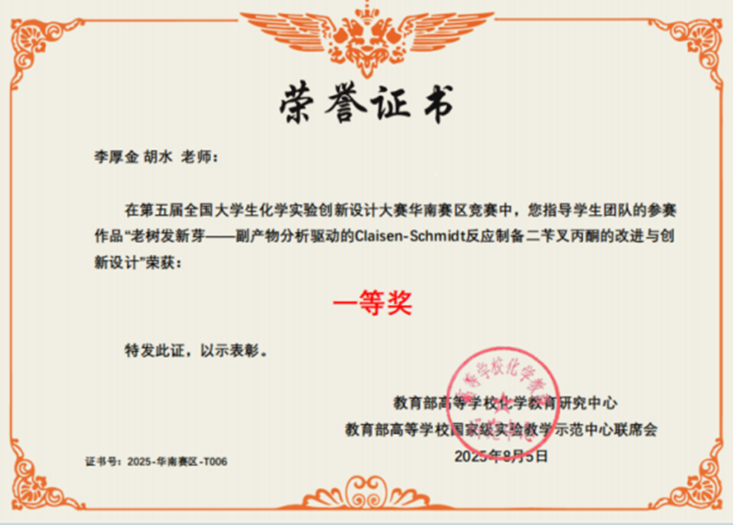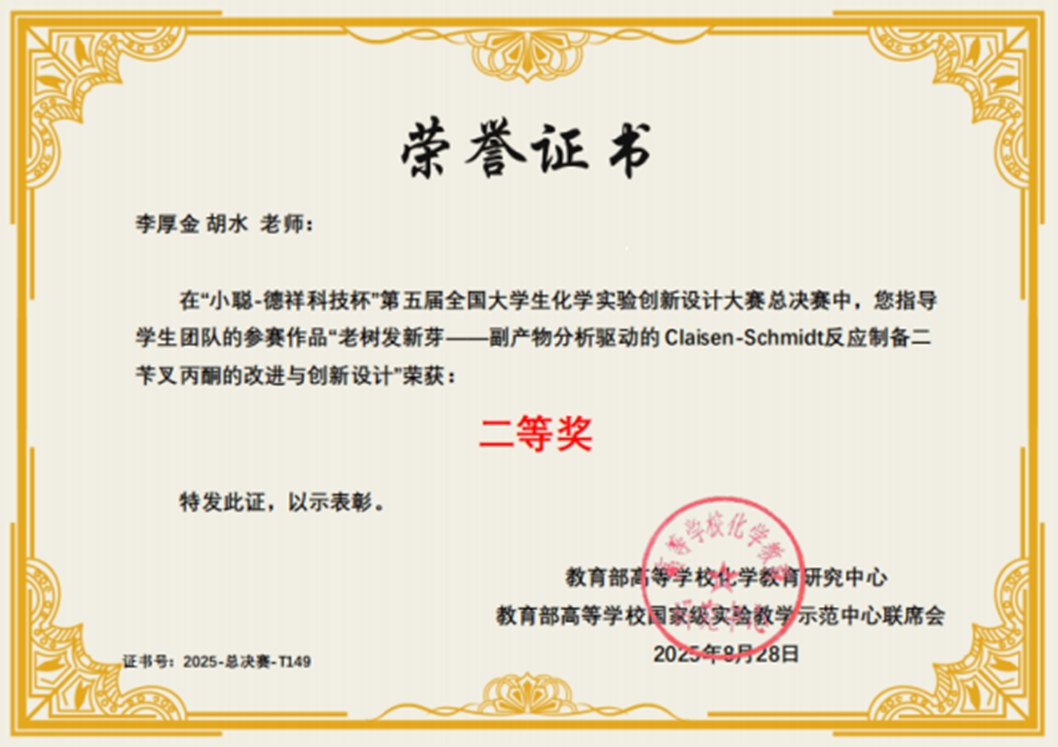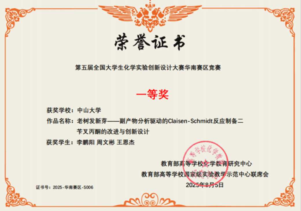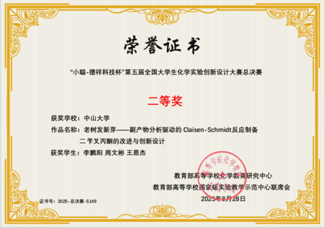 导航痕迹 中山大学 化学国家级实验教学示范中心 化学竞赛 第五届 (2024年和2025年) 全国大学生创新实验设计竞赛 中山大学-改进实验-总决赛二等奖、华南区一等奖 扫描此二维码分享 中山大学-改进实验-总决赛二等奖、华南区一等奖 发布人:网站管理员 发布日期:2025-10-09 老树发新芽——副产物分析驱动的Claisen-Schmidt(克莱森-施密特)反应制备二苄叉丙酮的改进与创新设计