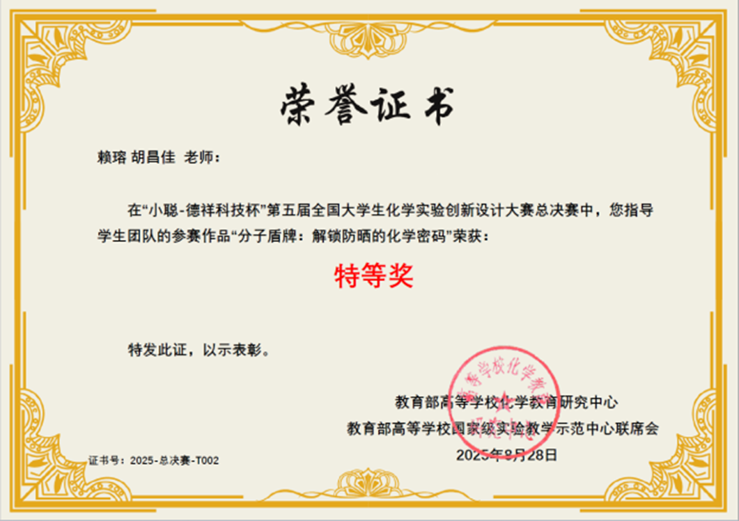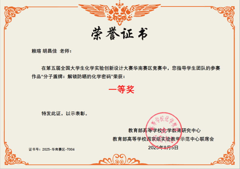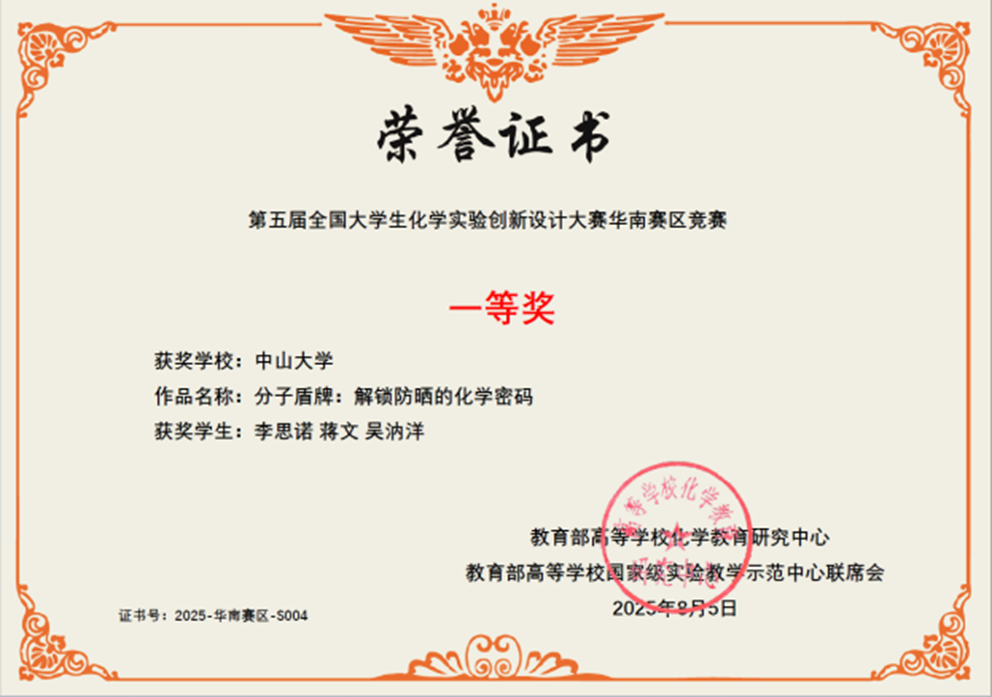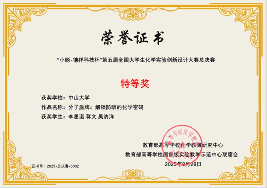 导航痕迹 中山大学 化学国家级实验教学示范中心 化学竞赛 第五届 (2024年和2025年) 全国大学生创新实验设计竞赛 中山大学-科普实验-总决赛特等奖、华南区一等奖 扫描此二维码分享 中山大学-科普实验-总决赛特等奖、华南区一等奖 发布人:网站管理员 发布日期:2025-10-09 分子盾牌:解锁防晒的化学密码