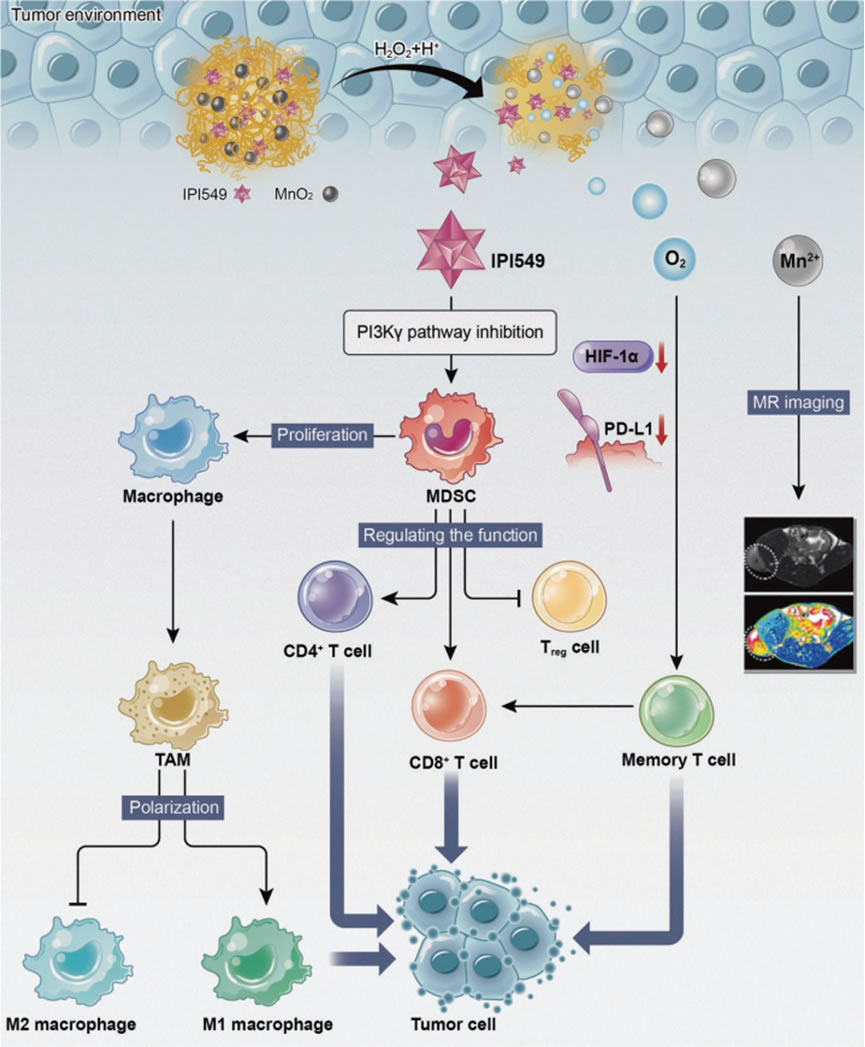 因此中山大学材料科学与工程学院帅心涛教授课题组与中山大学孙逸仙纪念医院沈君教授课题组,开发了一种包含MnO2颗粒和小分子IPI549的多功能纳米调节剂,它可以重塑肿瘤免疫微环境 (TIME) 以释放免疫系统。通过静脉给药的纳米调节剂能有效地积聚在肿瘤部位,通过氧化还原 MnO2 来缓解缺氧,并通过IPI549在肿瘤微环境 (TME)中的释放抑制MDSC上调的PI3Kγ,这使得在 PD-L1表达的同时下调肿瘤相关巨噬细胞针对促炎性M1 样表型的极化(TAMs)(肿瘤抑制),增强CD4+辅助T淋巴细胞(Th细胞)和细胞毒性 CD8+T淋巴细胞(Tc 细胞)的浸润,并抑制调节性T淋巴细胞(Treg 细胞)的浸润以有效肿瘤免疫治疗。此外,TME 中 Mn2+的局部生成可以使肿瘤部位产生特异性磁共振成像 (MRI)。此外,由于缺氧的缓解以及MDSC PI3Kγ 抑制的协同作用,纳米调节器重塑的TIME能被机体有效保留,在动物实验研究中在用药后能有效地抑制肿瘤再生长和转移。
