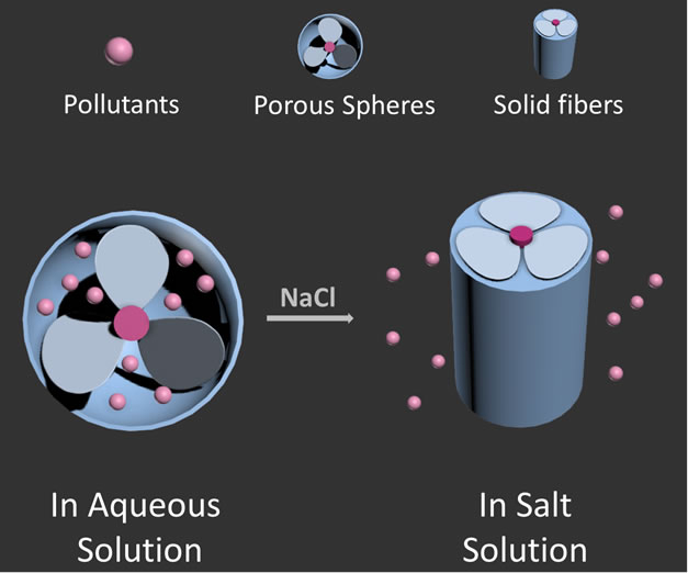 近日,304永利黄哲钢教授课题组以咔唑为中心,在其2,7,9号为分别进行芳基化,制备了新型的二维、三维的螺旋桨状芳香性两亲物, 并通过折叠芳香性平面的组装制备了空心球。与传统的基于一维芳香性分子的超分子多孔材料相比,二、三维π-共轭组装体在水溶液中提供了疏水性碳环境,可以吸附回收水中的有机污染物。研究结果表明,制备的介孔球对有机污染物—乙炔雌二醇(Eo)和双酚A(BPA)的回收率分别为92%和90%。值得注意的是,介孔球可以识别盐的浓度。随着盐的加入,折叠的芳香性分子被观察到逐渐变得平坦,诱导强的π-π相互作用,使多孔球体融化并相连一起形成实心的纤维。这种多孔向无孔材料的转变引发被吸附的污染物从多孔结构中自发释放,而随后的透析使超分子多孔结构恢复吸附容量。