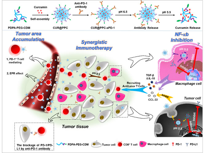 该研究工作受到国家973计划项目基金,国家自然科学基金, 广东省自然科学基金和广东省创新创业团队项目基金的资助。我校材料科学与工程学院的帅心涛教授为本研究的通讯作者,博士生肖泽聪为本研究的第一作者。 该研究以“Dual pH-sensitive nanodrug blocks PD-1 immune checkpoint and uses T cells to deliver NF-κB inhibitor for antitumor immunotherapy”为题于20202月在线发表在国际综合学术期刊Science Advances上。