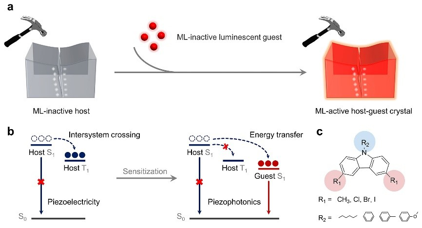 2020年,池振国教授研究团队提出利用一种更加简单的方法来精准设计力致发光复合材料体系的新设计策略。该策略设计的力致发光复合材料体系中,单独的主体材料和客体材料都不具有力致发光性能,但是通过主客体复合得到的复合体系则具有力致发光性能,实现了从无到有的力致发光。同时,客体材料的选择范围非常广,可以是纯有机发光材料、配合物磷光材料,也可以是无机量子点发光材料等等。通过改变客体材料的种类,非常容易调节力致发光的发光颜色、亮度、色纯度以及发光寿命等性能,极大地丰富了力致发光材料的研究内涵。结合光物理测试和理论计算,深入探究这类新型力致发光复合体系的激发过程和发射过程,并揭示了复合体系力致发光的激活机制是源于压电效应和主客体分子的能量转移。