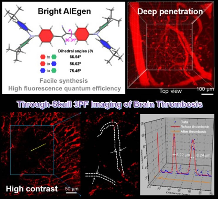 中山大学材料科学与工程学院梁国栋教授课题组与浙江大学光电学院钱骏教授课题组和香港科技大学唐本忠院士团队合作,设计和合成了AIE荧光分子BTF。该分子结构中含有电子给体三苯胺(TPA)、电子受体富马腈(FN)和叔丁基(t-Bu)基团,具有典型的电子给体-受体(D-A)结构,这赋予该分子深红/近红外发射和显著的多光子吸收的能力。该分子化学结构简单、合成简易,拥有显著的AIE特征和高效的固态荧光量子产率(42.6%)。通过纳米沉淀技术,进一步制备成尺寸均匀的AIE点。该AIE点具有高的发光效率、优良的生物相容性、大的斯托克斯位移、良好的光稳定性和大的三光子吸收截面,可用作三光子荧光纳米探针,对活体小鼠颅骨下血管进行三光子荧光成像,首次报道利用AIE点作为三光子荧光纳米探针对完整颅骨下脑血栓过程进行高分辨活体生物成像。这项工作有助于研发新的高效非线性发光染料,用于非侵入性活体生物成像和脑部疾病的研究。