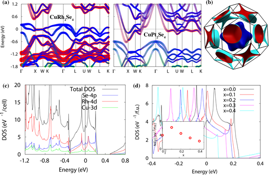 此外,我们与杭州师范大学曹超教授团队合作基于第一性原理,使用密度泛函理论计算得出未掺杂CuRh2Se4、CuPt2Se4的电子能带结构后,基于虚晶近似理论得出Cu(Rh1-xPtx)2Se4系统态密度与费米能级随掺杂量变化图像。理论计算表明铂元素替代铑元素导致CuRh2Se4的态密度峰发生红移,并在掺杂量x = 0.1时费米能级态密度达到最大值(如图3所示),这与实验观测得到的电子掺杂相图大致吻合。这不仅为理解尖晶石超导电性随电子掺杂的变化提供了理论依据,也对进一步探索新型尖晶石超导材料或尖晶石超导电性的提高提供了指导,同时为研究相关结构超导电性的机制提供材料平台。