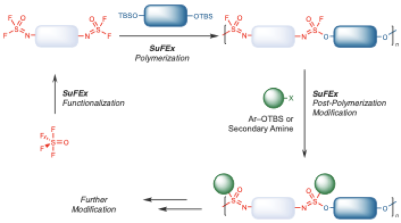 点击化学(Click Chemistry)是美国科学院院士、2001年诺贝尔化学奖获得者、美国斯克利普斯研究所Sharpless教授于1998年提出的概念(217th ACS National Meeting, Anaheim, CA),旨在通过高效的化学连接将分子片段快速拼装,实现在尽可能短的时间内获得更多的功能。Sharpless教授发展了两代点击化学,第一代为铜催化叠氮和炔的环化反应(CuAAC),第二代为六价硫氟交换反应(SuFEx)。这两代点击化学已经广泛应用于生物偶联、药物研发以及聚合物材料的制备和修饰。CuAAC反应和前期发展的SuFEx反应都是两个分子片段的高效拼装并在二维平面延伸,而多个分子片段的多维度高效连接将带来更多的应用潜能。
