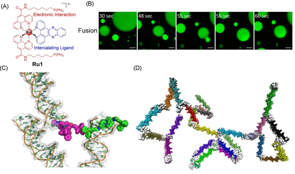 图1 (A)配合物Ru1的化学结构;(B)Ru1诱导DNA液-液相分离液滴的融合过程;(C)分子动力学模拟中Ru1与四分子DNA的结合模型;(D)分子动力学模拟粗粒化模型中Ru1与DNA的结合过程(2 μs)。