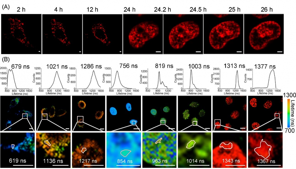 图2(A)Airyscan超分辨成像和(B)双光子磷光寿命成像对Ru1诱导活细胞诱导DNA相分离过程进行示踪。