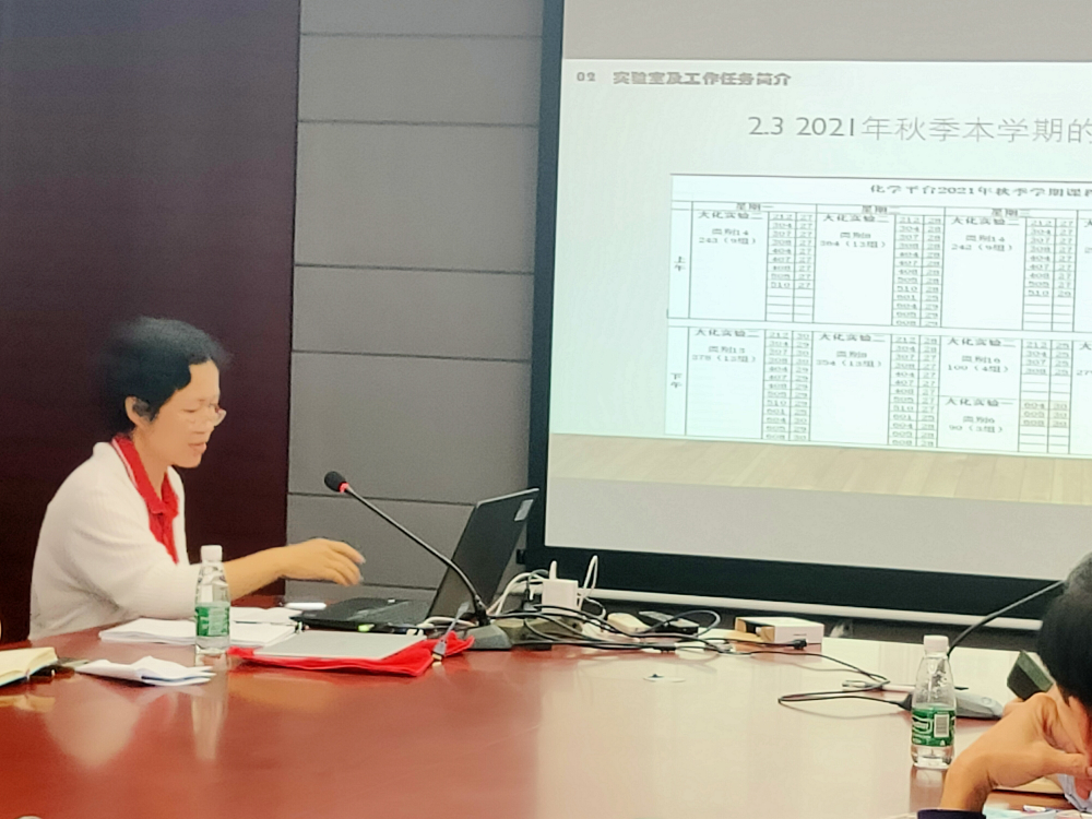 接下来,化学实验教学中心教学主管赖瑢老师分别从此次调整交接工作背景、本学期大类培养教学工作任务以及实验室简介、工作安排以及实验室管理这几方面对大类化学培养实验教学工作进行了详细地介绍,并与与会人员就实验室管理、教学准备工作等方面展开互动交流。赖瑢老师所在的基础化学实验技术团队为此次接任大类化学培养实验教学工作进行了大量地前期调研和探索,制定了详尽的本学期工作安排以及一系列制度化管理措施,为后续各项工作的开展奠定了坚实基础。