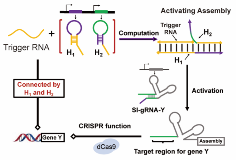 生物体内,复杂的基因网络是细胞发挥功能的基础。特定环境下,不同基因间相互交流将决定细胞命运。发展操控生物系统分子工具的一个重要目标是能够人为构建基因回路以调控细胞功能或控制细胞表型。比如,细胞内原本独立表达的X与Y两个基因,在引入人为构建的合成回路后,RNA-X能发挥调控RNA-Y表达的作用(图1)。试想,在癌细胞中,如果X为原癌基因, Y为抑癌基因,在两者间建立基因回路,以原癌基因诱发抑癌基因表达,将可能实现细胞癌变的源头防治;而如果X为病毒基因,Y为免疫相关基因,入侵的病毒引起某些免疫相关基因的表达,将可能实现剧烈地激活免疫反应以清除病毒。因此,建立细胞内源基因的关联调控将可能为细胞引入主动防御机制,以调节其在不同环境下的响应行为,而这也是人工改造细胞的一个重要目的。