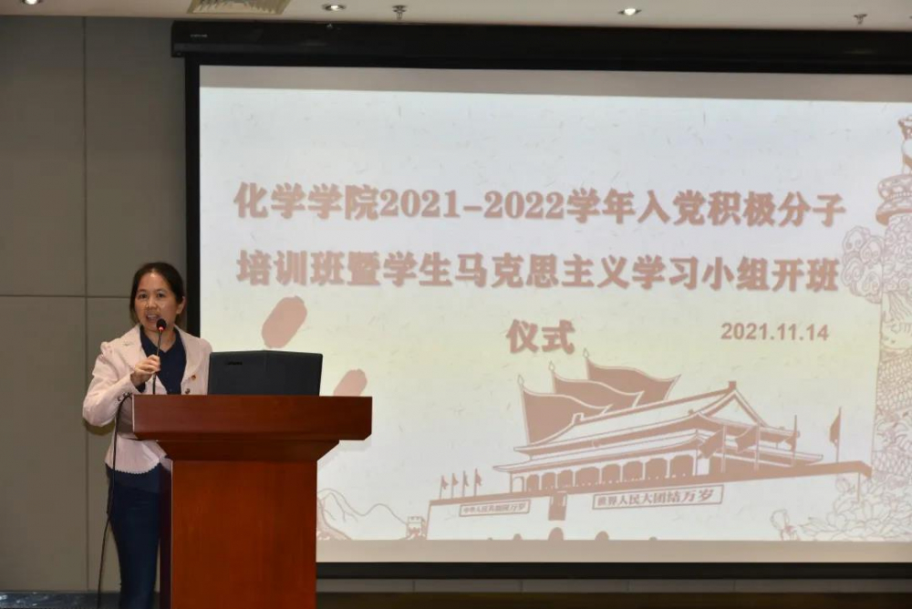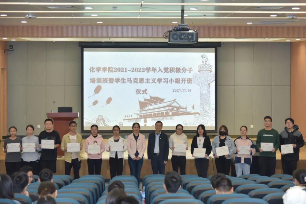 为落实学校团委关于院级党章学习班建设的工作,同时进一步发挥马克思主义学习小组引领学生思想教育作用,304永利于11月14日下午在东校园化学材料楼B303举办2021-2022学年马克思主义学习小组暨党章学习班开班仪式。党史专题报告专家朱志辉,学院党委副书记谭海燕,团委书记王帅,团委副书记王雪燕、刘健阳,研究生指导员代表,入党积极分子,研究生党支部和本科生党支部各马克思主义学习小组指导员代表等约150人参加了本次活动。