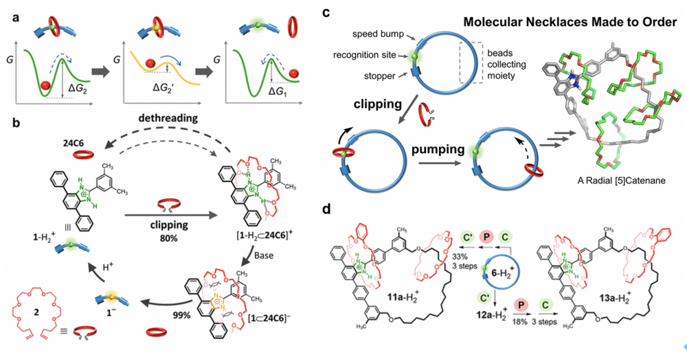 生命体内存在大量的生物分子机器,例如核糖体,它是生物体内蛋白质的“合成工厂”,能高效且精准地控制氨基酸按特定的序列连接成具有生理活性的肽链及蛋白质。师法自然,设计、合成及操控具有类似功能的人工分子机器是目前合成化学领域最前沿研究方向之一。近日,304永利朱克龙教授课题组报道了首例基于人工分子泵原理精准合成辐射型索烃——“分子项链”的研究成果,该工作以通讯论文发表于美国化学会会志J. Am. Chem. Soc.。一直以来,通过分子聚集、穿环及打结等形成的特殊拓扑结构深深地吸引了众多合成及材料化学研究者,而如何精准地控制多个大环分子同轴套环形成类似于项链结构的辐射型索烃是其中的难点。在前期研究工作中,该课题组利用夹套合成法(clipping)不仅成功实现了异环[3]轮烷分子梭的构筑(Nat. Chem. 2018, 10, 625–630),并发展了可用于敏感分子保护的新策略(Chem. Sci. 2017, 8, 7718–7723; Chem. Commun. 2021, 57, 3239–3242)。在此基础上,结合具有酸碱响应性的苯并咪唑模板分子,进一步发现了一种可用于定向输送大环的新型分子泵工作原理(pumping)。通过巧妙组合,先利用夹套合成法捕获原料生成产品(大环),再利用酸碱反应产生的能量驱动分子泵将产品定向输送至货物收集端,通过连续的“生产-输送”(clipping-followed-by-pumping, CFP)操作,最终实现了辐射型索烃即“分子项链”的可控合成。