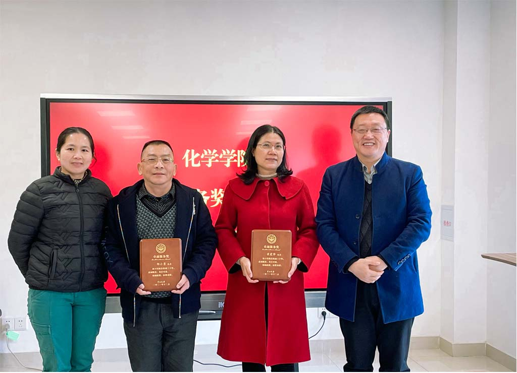 学校在近期发布了《中山大学关于授予刘正生等305人2021年中山大学卓越服务奖的决定》,我院邹小勇、黄爱萍老师在中山大学累计工作30年,服务记录良好,获颁卓越服务奖。2月23日上午,学院在化学与材料楼A302会议室举行卓越服务奖颁奖仪式。学院党委冯双书记、谭海燕副书记、获奖老师及部分教职工参加仪式。