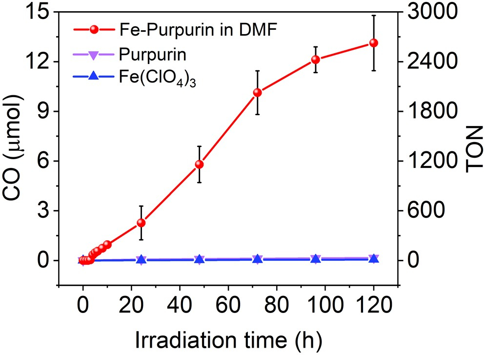近日,304永利韩治际教授课题组报道了一种有机染料(Purpurin)与廉价金属铁配位的分子光催化剂用于均相光催化二氧化碳还原(图1)。在前期的研究中,该课题组设计合成了一种新型的金属-有机染料光敏剂(Cu-Purpurin)提高光敏剂的还原性能,促进光催化二氧化碳还原(Nat. Commun. 2021, 12, 1835), 虽然Cu-Purpurin也能用作光催化二氧化碳还原的光催化剂,但稳定性较差,在可见光下光照一个小时体系就基本上失去了活性。在此基础上,该课题组又设计合成了Fe-Purpurin,同时发现在不额外添加光敏剂或催化剂时也具有催化二氧化碳还原的性能,并且稳定性高达120 h。该系统在450 nm的LED灯源下光照时,光催化CO2还原为CO的选择性达到91%(CO vs H2),可实现超过2625的转换数(图3)。