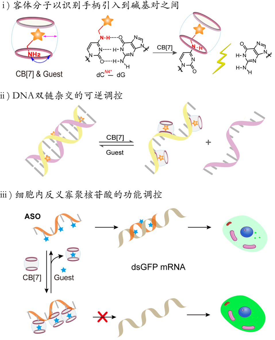 基于此,徐亮课题组发展了一种基于主客体识别的配体入侵策略以控制核酸动态结构和分子功能的配体调节方案。作者提出在核酸双链之间引入“识别手柄”的概念,而这些识别手柄能够作为分子识别的重要抓手,以影响核酸双链的分子结构。以葫芦[7]脲作为主体分子代表,作者将具有不同结合能力的客体分子嵌入核酸碱基对中,通过主客体相互作用来破坏Watson-Crick碱基对并诱导DNA双链结构的直接解离(图i),由此成功实现了正交和可逆地操纵DNA双链的解离与复性(图ii)。作者进一步将这种配体控制核酸杂交的方法用于调节核酸酶的催化行为,以及在细胞内操控反义寡聚核苷酸的基因表达调节功能(图iii)。与光照相比,这种配体入侵的策略能够在特定情况下表现出显著的优越性,如配体分子能够深入到光照无法穿透的组织内部,并实现精确的剂量依赖性控制。相关研究成果提出了通过超分子相互作用动态调节核酸结构的一种普适性策略,将为动态核酸结构在材料构建和生命体系功能调控中提供一种全新的操控技术。