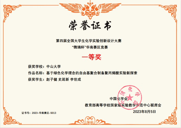 2023年8月20-23日, “微瑞杯”第四届全国大学生化学实验创新设计大赛总决赛在浙江大学举行,我院阮文红、朱芳两位教授共同指导本院2021级本科生赵子健、史延新、李世成参赛并荣获总决赛特等奖,获奖作品为“基于绿色化学理念的自由基聚合制备聚丙烯酸实验新探索”。