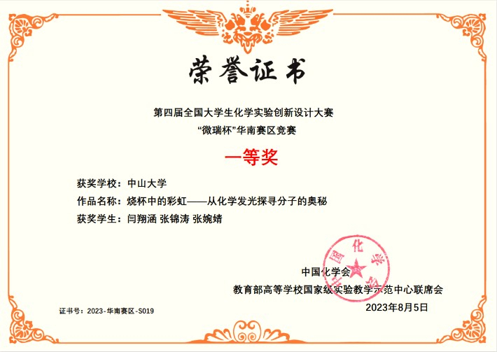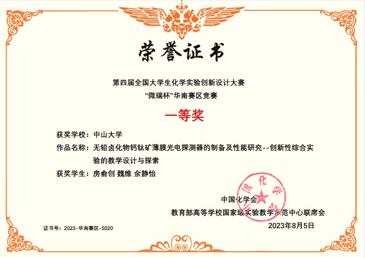 在华南赛区竞赛中,我院选送的三个作品均获得一等奖,分别为:改进实验作品《基于绿色化学理念的自由基聚合制备聚丙烯酸实验新探索》(指导教师:阮文红、朱芳;队员:赵子健、史延新、李世成)、新创实验作品《无铅卤化物钙钛矿薄膜光电探测器的制备及性能研究--创新性综合实验的教学设计与探索》(指导教师:王旭东、陈洪燕;队员:房俞创、魏维、余静怡)以及科普实验作品《烧杯中的彩虹——从化学发光探寻分子的奥秘》(指导教师:潘梅、鲁玉麟;队员:闫翔涵、张锦涛、张婉婧)。因赛制规定每校仅能推荐一项作品参加全国总决赛,根据赛事遴选规则,由改进实验作品代表我校参加总决赛。在总决赛中,该作品在全国90项参赛作品中脱颖而出,荣获全国总决赛特等奖。