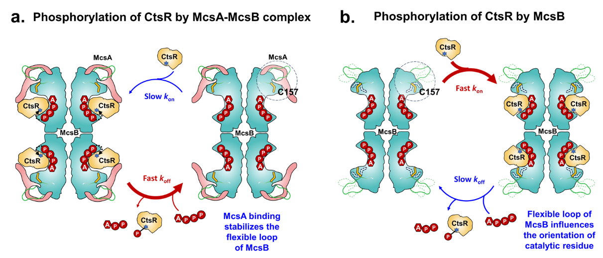 此项工作首次解析了激酶复合物McsA-McsB的冷冻电镜结构,揭示了McsA通过锌指结构域及α螺旋与McsB结合,稳定了McsB的关键催化半胱氨酸残基C157并显著降低了底物蛋白CtsR与McsB的结合能力,加速磷酸化CtsR的离去速率,从而增强McsB的精氨酸激酶活性,实现对CtsR的磷酸化修饰。这种磷酸化修饰通过McsA激活McsB后对CtsR的精准调控,使得CtsR的抑制作用得以解除,从而迅速响应环境变化,有效维持了细胞内蛋白质的质量和功能稳定。