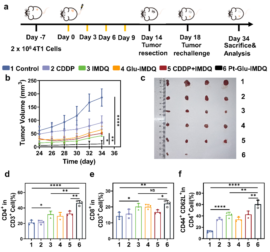 随后,Pt-Glu-IMDQ通过巨噬细胞复极化和树突状细胞成熟增强先天免疫,同时通过效应T细胞浸润和记忆T细胞生成增强适应性反应。利用化疗和免疫治疗之间的协同根除了原发肿瘤,建立的持久保护性免疫来抑制肿瘤复发,取得了良好的治疗效果,且未对小鼠健康产生明显影响,安全性良好。该研究设计的双锁铂(IV)前药介导化疗与免疫治疗手段联合使用,有望提升其疗效,成为精准癌症治疗的重要工具。