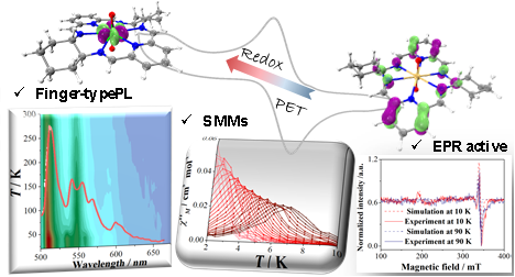 近期,童明良团队利用平面N6大环配体合成了一例具有六角双锥局部对称性的五价铀酰配合物,并对其理化性质进行了深入探究,其中包括氧化还原活性,磁学和发光性能。结合理论计算,通过电化学、EPR、静态/动态磁性以及吸收/发射光谱等测试手段证实了六价/五价铀酰配合物间内禀转化机理,对组成明确的五价铀酰配合物的磁光性质进行了深入的构效关系研究。该工作首次揭示了基于5f1电子组态的特征指状光致发光性能和场致单分子磁体行为的协同特性,同时拓展了光活性多氮杂环自由基配体在铀酰配合物中的应用,深入探索了利用光刺激实现铀(VI)到铀(V)的有效转化过程。