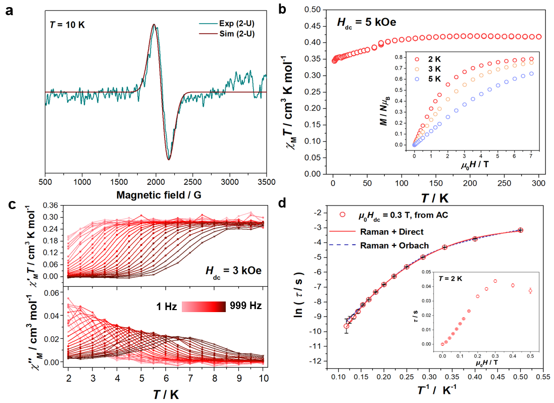 图3. 五价铀酰配合物的低温X-波段EPR波谱 (a), 直流 (b) 及交流 (c) 磁性以及磁弛豫过程分析 (d)。