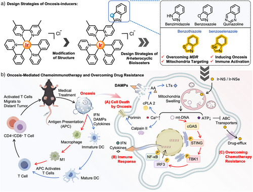 近日,中山大学巢晖教授团队设计开发了一类线粒体靶向的铱(III)基免疫原性胀亡诱导剂。该类诱导剂不仅能有效突破肿瘤多药耐药瓶颈,还可通过激活机体免疫系统,实现化疗与免疫治疗的协同增效,为癌症治疗提供了新策略(图 1)。研究表明,这类铱(III)基配合物具备多重优势:其一,可通过原位可视化实现细胞内定位追踪,同时显著克服顺铂、阿霉素等临床常用化疗药物的耐药性局限;其二,能高效诱导免疫原性细胞死亡(ICD),并协同激活 cGAS-STING 通路,成功构建 化疗杀伤免疫激活” 的协同治疗模式。从作用机制来看,配合物能快速靶向肿瘤细胞线粒体,破坏其结构完整性,同时升高细胞内氧化应激水平、促进钙离子(Ca2+)释放。这一系列变化会进一步激活CalpainPorimin蛋白,最终在多药耐药肺癌细胞(A549R)中启动胀亡通路。此外,转录组学分析证实,其还能通过重组肌动蛋白细胞骨架、调节 ABC 转运蛋白活性、重塑糖酵解与糖异生代谢途径。