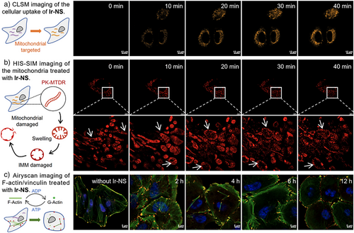 3. a)铱基胀亡诱导剂的示踪; b)线粒体结构变化; c)细胞骨架变化。
