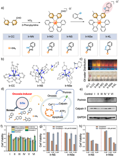 本研究采用生物电子等排体设计策略,对铱(III)多吡啶配合物进行简单杂环修饰,开发结构简单、合成高效、线粒体靶向的铱(III)基胀亡诱导剂,并成功筛选出苯并噻唑和苯并硒唑是诱导胀亡的关键结构(图2)。这类铱(III)配合物引发胞内Ca2+超载,特异性激活钙依赖性蛋白酶(Calpain),同时上调膜蛋白 Porimin 的表达,最终共同驱动细胞进入胀亡程序。