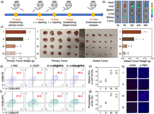 铱基胀亡诱导剂导致线粒体功能障碍和mt-DNA损伤可强效激活 cGAS-STING 先天免疫通路和细胞免疫原性死亡,双重作用共同激活免疫反应,包括树突状细胞成熟、M1 型巨噬细胞极化以及细胞毒性 细胞激活,从而重塑肿瘤免疫微环境,并在体内建立长期免疫记忆。凭借化疗与免疫治疗的协同效应,该体系不仅有效根除原发肿瘤,还能建立持久保护性免疫屏障以阻断肿瘤复发,治疗成效显著(图4)。同时未对小鼠产生明显健康损害,安全性得到充分验证。