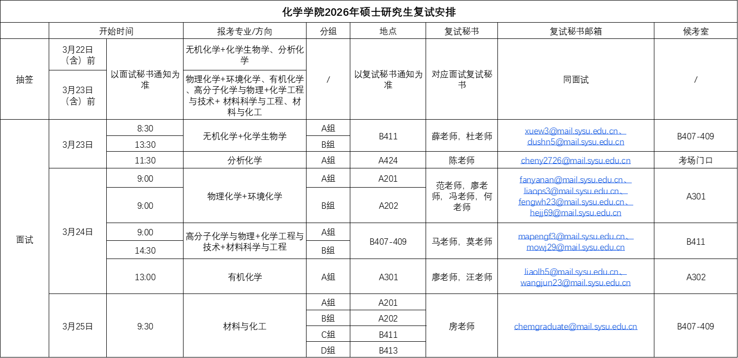 2.复试地点:广州市番禺区大学城外环东路132号中山大学广州校区东校园化学与材料综合楼各考场;