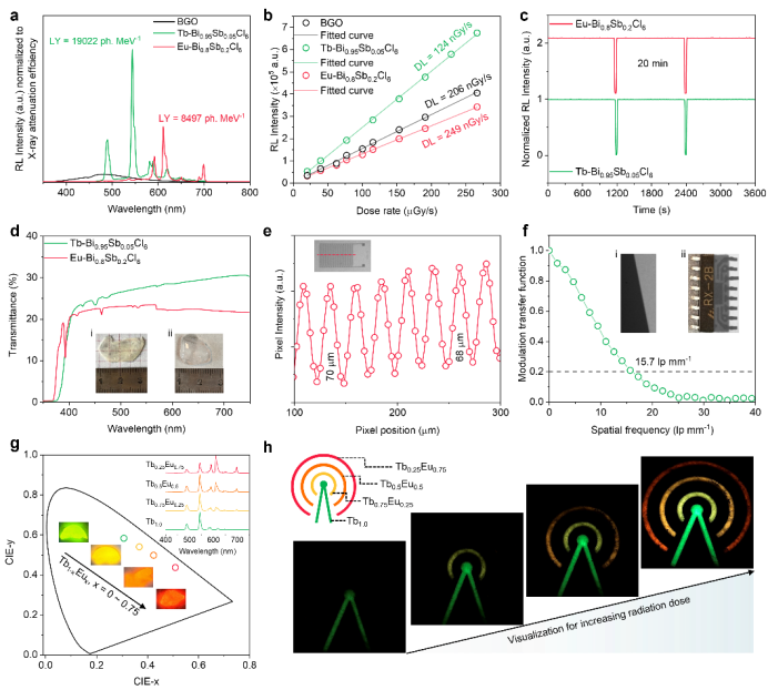 研究结果表明,通过优化Sb浓度,Tb基单晶闪烁体(Tb-Bi0.95Sb0.05Cl6)和Eu基单晶闪烁体(Eu-Bi0.8Sb0.2Cl6)实现了2.06倍和1.33倍的辐射发光增强。Tb-Bi0.95Sb0.05Cl6光产额达到19022 Photons/MeV,检测限低至124 nGy/s,远低于常规医疗诊断所需的剂量率。厘米级单晶的成功生长使其在X射线成像中实现了15.7 lp/mm的高空间分辨率,能够清晰分辨微米级精细结构。此外,通过调控Tb/Eu比例,研究团队还实现了从绿光到红光的可调谐辐射发光,展示了该材料在彩色可视化辐射剂量检测方面的应用潜力。该工作不仅提供了一类高效、环保的新型闪烁体材料,更重要的是揭示了光致发光与X射线激发下截然不同的发光机制,阐明了“高光致发光量子产率并不等同于高闪烁性能”这一关键科学问题。提出的三重态激子捕获策略为开发下一代高性能稀土基闪烁体材料提供了新范例。