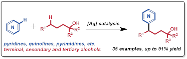 (25) Miao Wang, Changzhen Yin, Peng Hu*, Ag-catalyzed remote unactivated C(sp3)−H heteroarylation of free alcohols in water, Org. Lett. 2021, 23, 722–726. (Featured by Synfacts, 2021, 17, 408)