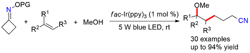 Visible-light promoted γ-cyanoalkyl radical generation: three-component cyanopropylation/etherification of unactivated alkenes.