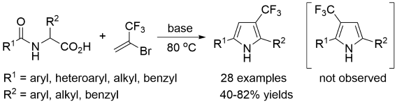 Regioselective Synthesis of 3-Trifluoromethylpyrroles by [3+2] Cycloaddition of N-Acyl -Amino Acids and 2-Bromo-3,3,3-trifluoropropene.