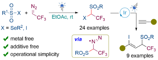 Visible-Light-Promoted Radical gem-Selenosulfonylation or Iodosulfonylation of 2,2,2-Trifluorodiazoethane under Photosensitizer-free Conditions.