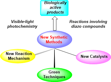 •       The increasing need for more efficient synthetic methods and sustainable processes can be seen as a major driving force for new inventions; it also stimulates the creative rethinking of known concepts, which, in turn, will lead to the development of innovative chemistry. The research interest of our group focuses on synthesis of biologically active compounds in concert with the discovery and the development of new reactions and strategies for organic synthesis. We are inspired by the pursuit of new concepts involving new catalysts, green techniques, and new reaction mechanisms. Visible light is inexhaustible, environmentally benign, and easy to handle. Moreover, light excitation is especially favorable to processes of oxidation and reduction. From these points of view, the use of visible light as a driving force for chemical reactions has attracted our attentions. Currently, our research group focused primarily in the field of visible light photoredox catalysis, exploring its unique catalytic performance and developing new organic reactions. The concerns include: